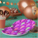 A paper plate with a cool multicolored pattern with abstract feathers and a purple pink background. A modern vibrant stylish design.