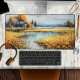 Desk mat featuring a colorful painting of a spacious summer landscape with a creek and wildflowers.