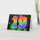 The front of this exciting, fun, and vibrant greeting card design features a colorful pattern inspired by celebratory fireworks, along with the number "19" featuring a multicolored rainbow like gradient pattern, on a black colored background. The inside features a customized greeting message, or could perhaps be cleared and left blank if a message is to be written by hand instead. A greeting card like this might be a fun way to celebrate somebody’s nineteenth birthday, or perhaps a couple’s nineteenth wedding anniversary, or some other 19th event. [~Z0000342]