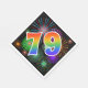 This exciting, fun, and vibrant paper napkin design features a colorful pattern inspired by celebratory fireworks, along with the number "79" having a multicolored rainbow like gradient pattern, on a black colored background. Paper napkins like these might be fun to use at a celebration being held to commemorate somebody’s seventy ninth birthday, or perhaps a couple’s seventy ninth wedding anniversary, or some other 79th event. [~Z0000340]