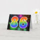 The front of this exciting, fun, and vibrant greeting card design features a colorful pattern inspired by celebratory fireworks, along with the number "86" having a multicolored rainbow like gradient pattern, on a black colored background. The inside features a customized greeting message, or could perhaps be cleared and left blank if a message is to be written by hand instead. A greeting card like this might be used to send a message acknowledging somebody’s eighty sixth birthday, or perhaps a couple’s eighty sixth wedding anniversary, or some other 86th event. [~Z0000342]