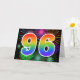 The front of this exciting, fun, and vibrant greeting card design features a colorful celebratory fireworks inspired pattern, along with the number "96" featuring a multicolored rainbow inspired gradient pattern, on a black colored background. The inside features a custom greeting message, or could perhaps be cleared and left blank if a message is to be written by hand instead. A greeting card like this might be a fun way to acknowledge somebody’s ninety sixth birthday, or perhaps a couple’s ninety sixth wedding anniversary, or some other 96th event. [~Z0000342]