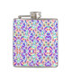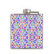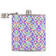 Colorful flask with intricate floral and geometric patterns in purple, blue, green, and orange. Front and side views highlight the vibrant design.