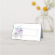 Wedding folded place card done in white and light teal with a lovely illustration of a purple and teal bouquet of flowers. The front is ready to personalize by hand for each guest at your wedding.