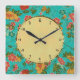 Colorful retro flowers collage pattern with blue green background and yellow and red flowers.