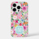 Customize this gorgeous modern colorful flower garden of flowers in pink, orange, blue and yellow iPhone 16 pro case with your your initials in a modern CAP font in white on blue. It's so vibrant and happy!