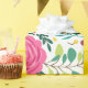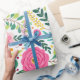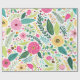 Colorful floral pattern with pink, yellow, and peach flowers, various green leaves, and small orange and red accents on a white background. Bright and cheerful.
