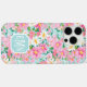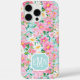 Customize this gorgeous modern colorful flower garden of flowers in pink, white, and yellow iPhone 16 pro max case with your your initials in a modern CAP font in white on blue. It's so vibrant and happy!