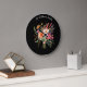 Add this pretty clock to the wall for rustic elegance and floral style. The clock is illustrated with a hand-tied bouquet of fresh summer flowers, on a contrasting black background. The clock can be personalized with a name or other text of your choice, in elegant script typography. An ideal gift for kitchen and home in country farmhouse style.