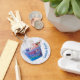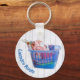 Keep the laundry room key on a fun key chain designed with a photograph of a blue basket full of colorful folded clothes on hangers and a detergent bottle forward of rustic white wood. Personalize the text, remove the text or click customize to select a font style, size, and color you prefer.