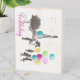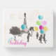 Artistic Birthday design featuring the Eiffel tower silhouette with french macaron clouds and silhouettes of kids playing with colorful French macaron balloons.