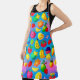 A lively, playful pattern of tropical fruits and cheerful flowers on a bright blue background. Perfect for kids' designs, summer campaigns, or upbeat lifestyle visuals and decorative projects.
