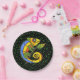 Image is my original painting. This colorful smiling abstract lizard is hanging on a branch with a large leaf at the end. Fun for kids. He is done in greens, blues, yellows, and oranges. See my store Art by MAR for matching products with this design.