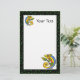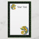 Personalize this stationary with any text you wish. Image is my original painting. This colorful abstract lizard is hanging on a branch with a large leaf at the end. He is done in greens, blues, yellows, and oranges. The border is black with bright green dots. See my store Art by MAR for matching products with this design.