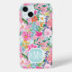 Customize this gorgeous modern colorful flower garden of flowers in pink, purple, blue and yellow iPhone 15 plus case with your your initials in a modern CAP font in white on blue. It's so vibrant and happy!