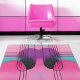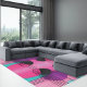 This colorful area rug features geometric circles and shapes in shades of pink, turquoise, purple and black with several thin black lines. This rug will add a pop of color to any minimalist or modern room. Available in a variety of sizes and shapes.