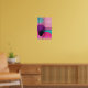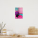 This colorful unframed poster features geometric circles and shapes in shades of pink, turquoise, purple and black with several thin black lines. This minimalist print will add a pop of color to any minimalist or modern room. Choose from a variety of print sizes that fit economical standard frames for an inexpensive way to create a stylish room.