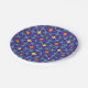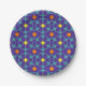 Colorful geometric pattern featuring blue cross shapes, orange circles, and yellow star-like shapes on a deep purple background. Bright and symmetrical.