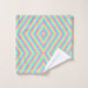 "Colorful geometric pattern towel set and washcloth with diamond shapes in pastel hues of pink, green, and blue creating a vibrant, lively design."