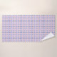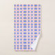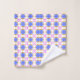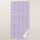Colorful geometric patterned towels are displayed; they feature a repeating design of purple, yellow, and pink shapes, conveying a vibrant and lively tone.