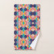 Colorful geometric-patterned towels hang on a silver rod, showcasing vibrant shades of blue, pink, yellow, and red. Below, a matching washcloth is neatly displayed.