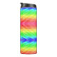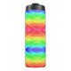 Colorful geometric travel mug with a rainbow pattern, featuring vibrant diamond-shaped designs. The black lid adds a sleek contrast to the bold hues.