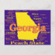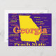 Colorful purple and yellow Georgia state pride pop art image including map silhouette with cities, towns and nickname.