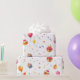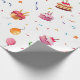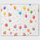 This image displays a beautiful gift wrapping paper printed with colorful celebration motifs on a white background. The design features festive shapes like balloons and confetti in shades of yellow, orange, purple, and blue, giving the paper a cheerful and lively look. This type of wrapping paper is perfect for special occasions such as birthdays or Christmas, making gifts look more attractive and festive.