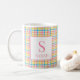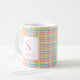 Brighten your day with this cheerful personalized mug featuring a vibrant gingham check pattern in playful pastel pink, yellow, blue, and orange. The fun, picnic-ready design includes a stylish frame for your personalized details. Easily customize it with your name and initial to create a charming, customized coffee cup. It's a delightful personalized gift for spring birthdays, Easter, or a cute accessory for home and office.