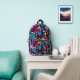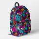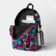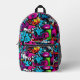This backpack showcases a vibrant and intricate graffiti-inspired design, perfect for those who embrace urban art and a bold, expressive style. The all-over print is a high-energy collage of stylized, bubbly letters and abstract shapes in a striking color palette of neon pink, electric blue, lime green, and magenta, creating a dynamic visual flow. Playful characters with cartoonish eyes are cleverly integrated into the chaotic composition, adding a whimsical touch. This design appeals to a younger audience, including teens and young adults, who appreciate street culture, artistic expression, and statement accessories. It's an ideal choice for students, artists, or anyone looking to infuse their everyday look with a touch of Y2K-inspired, hip-hop aesthetic.