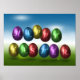 Modern colorful Easter illustration featuring metalic style foil wrapped colored Easter eggs with "Happy Easter" lettering on a spring sky background.