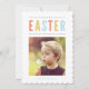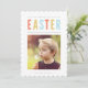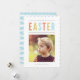 A fresh, modern Easter photo card with a spring color palette of Coral, yellow and sky blue and a painted stripe coordinating pattern backer.