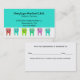 Colorful dentist business card done in aquamarine, with a white band on the bottom, with a line of colorful cartoon happy teeth. Text in black is fully customizable and ready to personalize for your pediatric dentist practice.