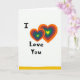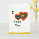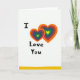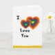 This greeting card shows two layered hearts floating near the upper-right area, with one heart slightly bigger and set just above the other. Each heart has rings of color that move from orange on the outside to dark red, then blue, then green, and a bright yellow center, giving them a cozy, loving look 💘❤️. The hearts feel like they’re leaning toward each other, like a quiet hug. In the lower-left area, the words “I Love You” appear in a loose, hand-drawn style with smooth curves and a slightly uneven line. The text is dark and stands out clearly against the white background, making the message easy to spot. A thin yellow strip runs along the bottom edge, adding a simple finish without taking attention away from the hearts. Overall, it feels sweet and direct, perfect for a partner or someone you care about 😘. Share it to send a little Valentine’s Day love and kind feelings.