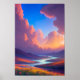 The river rushes through the picturesque valley, surrounded by hills of vibrant hues, as the sun sets behind the clouds. The scenery is a stunning display of nature's beauty, with colors ranging from deep greens and blues to bright oranges and pinks.