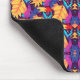 Colorful, intricate geometric pattern on a mouse pad, featuring vibrant orange, yellow, and blue shapes, creating a lively and dynamic design.