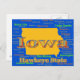 Colorful Iowa state pride image including map silhouette with cities, towns and nickname.