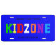 This colorful bedroom or playroom wall decor features the text KID ZONE in bright bold primary colors on a blue background. Easily personalize this fun, decorative license plate with a name or other text.