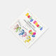 Colorful childrens birthday party napkins, featuring the text "Baby Shark", a yellow shark holding a bunch of balloons with four other happy colorful sharks and sprinkle confetti.