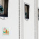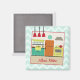 A kitchen magnet featuring an illustration of a retro inspired kitchen with turquoise, yellow, red, and orange color scheme. Background is light blue with zig zags. Personalize the red text with your name.