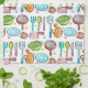 Kitchen / dining utensils and crockery doodles in colorful pattern.