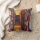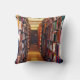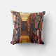 This colorful throw pillow takes you on a walk down long aisles of books in the stacks of a huge library. The bright lighting reveals book spines in a kaleidoscope of colors: red, green, blue, black, white, gold, brown, purple. The symmetrical angle creates a geometric abstract pattern that seems to lead to infinity. The design is repeated on the back.
