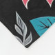 This seamless pattern features a variety of colorful flowers and leaves on a dark background. The flowers are in a variety of colors, including red, orange, yellow, pink, purple, and blue. The leaves are blue and grey.