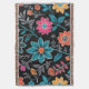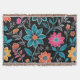 This seamless pattern features a variety of colorful flowers and leaves on a dark background. The flowers are in a variety of colors, including red, orange, yellow, pink, purple, and blue. The leaves are blue and grey.