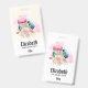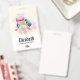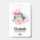 Personalized name badge with a delightful image. 3 colorful macarons, pink, green and blue with a fancy rose floral bouquet and a splash of pink watercolor behind. Delicious and stylish too! Light yellow background.