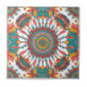 This ceramic tile features a vibrant and intricate mandala design with a floral bohemian aesthetic. The centerpiece showcases an explosion of symmetrical patterns in shades of teal, coral, orange, and yellow, creating a lively and harmonious color palette. Surrounding the central motif are detailed botanical elements, including stylized leaves, flowers, and ornamental accents, which add depth and complexity to the overall composition. The design radiates energy and warmth, making it perfect for decorative walls, tabletops, or as an artistic statement in eclectic or Mediterranean-inspired interiors.