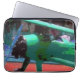 The colorful design on this 13” Laptop Sleeve is an original photograph by ZoeSPEAK of a model airplane. The plane is sea foam green, with a cornflower blue propellor on a black mount, and black tires. There is an aqua blue band at the edge of a salmon pink floor. The plane's wing cuts a diagonal line across the top of the photo, against a warm dark gray background. Little kids and big kids who love to fly will love this model airplane design.