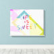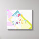This colorful modern style quote canvas wall art life is sweet text has a geometric bold design with pink, green, blue and purple shapes. Wall art for contemporary decor in home or office.