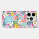 Customize this gorgeous modern colorful flower garden of flowers in pink, blue, orange, yellow and white iPhone 15 pro case with your your initials in a modern CAP font in white on blue. It's so vibrant and happy!
