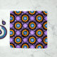 Seamless geometric pattern featuring geometric shapes in black, turquoise and orange on a purple background.